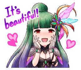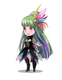 Mephilia is a 24 year old woman with red eyes and long green hair with purple tips, with part of it held in a bun, while the rest hangs down. She has a colorful hair ornament, made of four "feathers" that are pink, blue, yellow, and red, held together by a decorative brooch. She has a black choker, with metal shoulder-guards, with pink, blue, and yellow "feathers" going outwards. She has metal cuffs on her wrists with a small, green gem at the middle of each cuff. Her dress is a black strap dress that has the ends cut into diamond-like shapes, which are tilted outwards, with multicolored diamond-like fabric pieces filling in the gaps of the dress. The dress also has four small gems, two green and two blue, that go down the front of the dress. She also has brown stockings with tall, black, high heeled boots. Her weapon of choice is a rod she named Arianrhod.