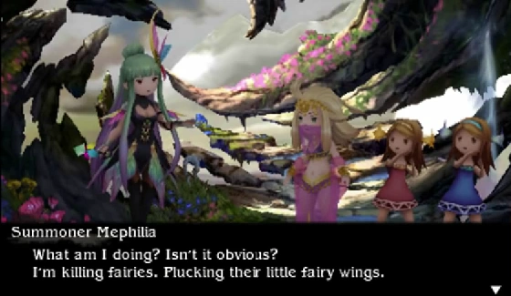 A twenty-four-year-old woman from Eternia. Her name is Mephilia Venus, and she holds the summoner asterisk. Her mind is broken, and she delights in seeing the destruction of beauty.